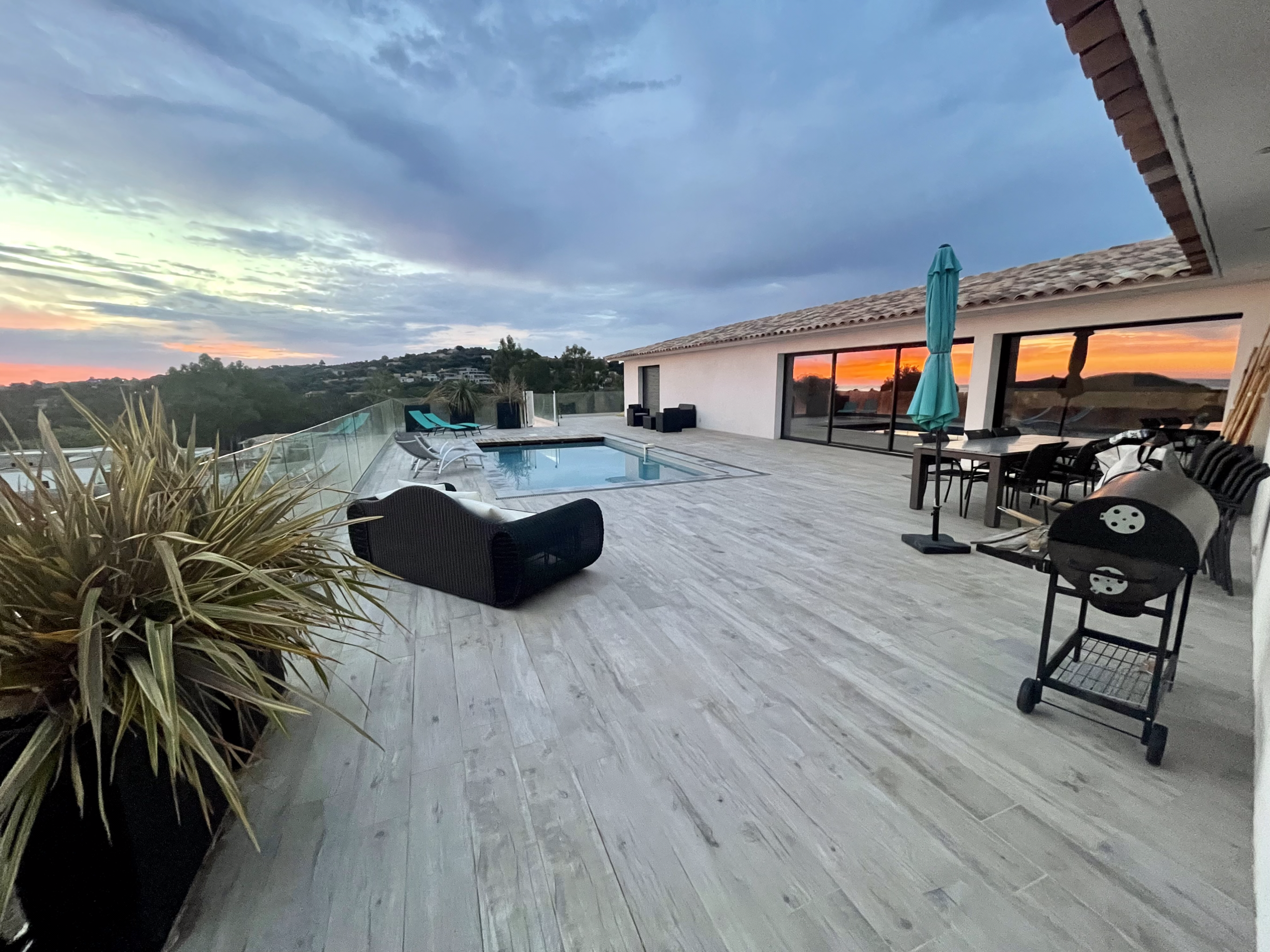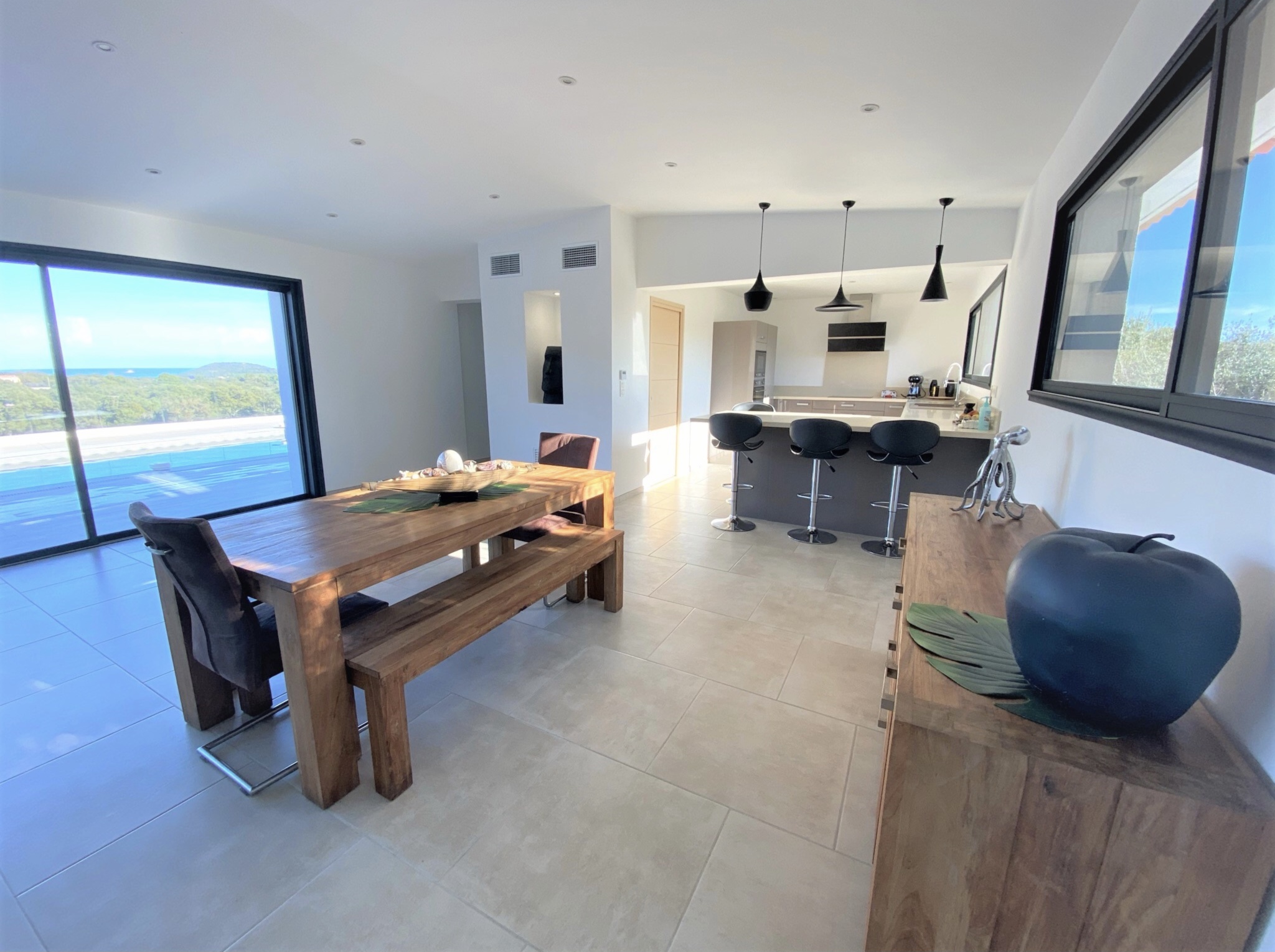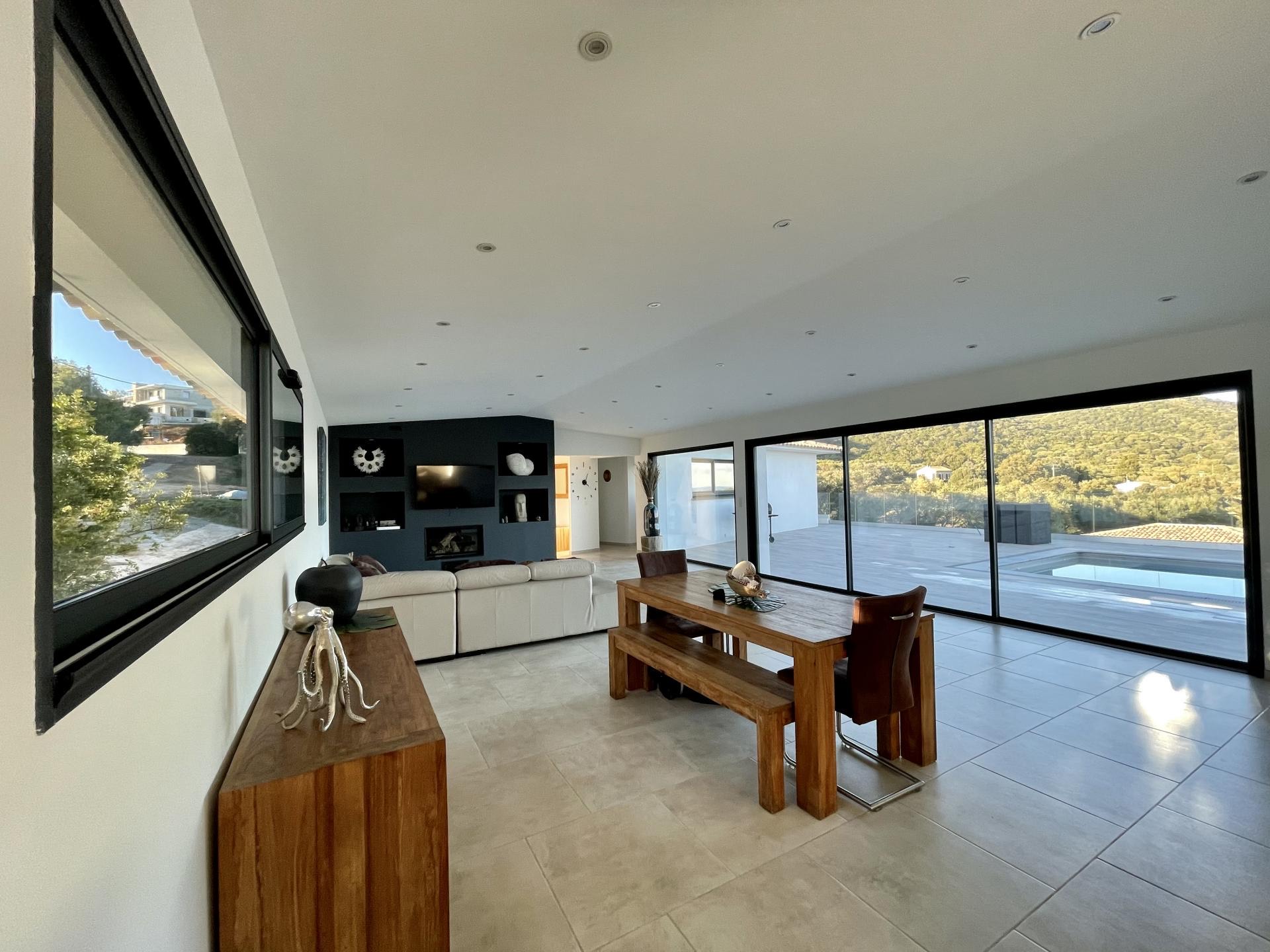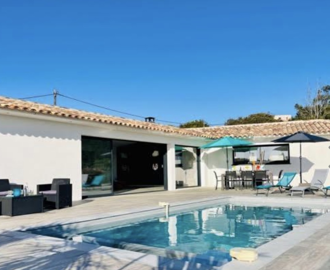 Villa récente de 180 m² entièrement climatisée se compose d’une lumineuse pièce de vie traversante avec une cuisine ouverte aménagée et équipée d’un four, micro-ondes, Nespresso + cafetière à grain, plaque à induction, lave vaisselle…, un cellier avec frigo américain, et lave-linge, un coin salon salle à manger avec TV, internet, baies vitrées à galandage donnant accès à une grande terrasse aménagée et équipée de mobilier de jardin, une piscine au sel de 8x4 m sécurisée par une alarme avec une vue panoramique sur la baie de Pinarello. Une suite parentale avec lit en 160, salle d'eau, deux chambres avec lits en 140 et une chambre enfant avec un lit superposé et un lit gigogne.