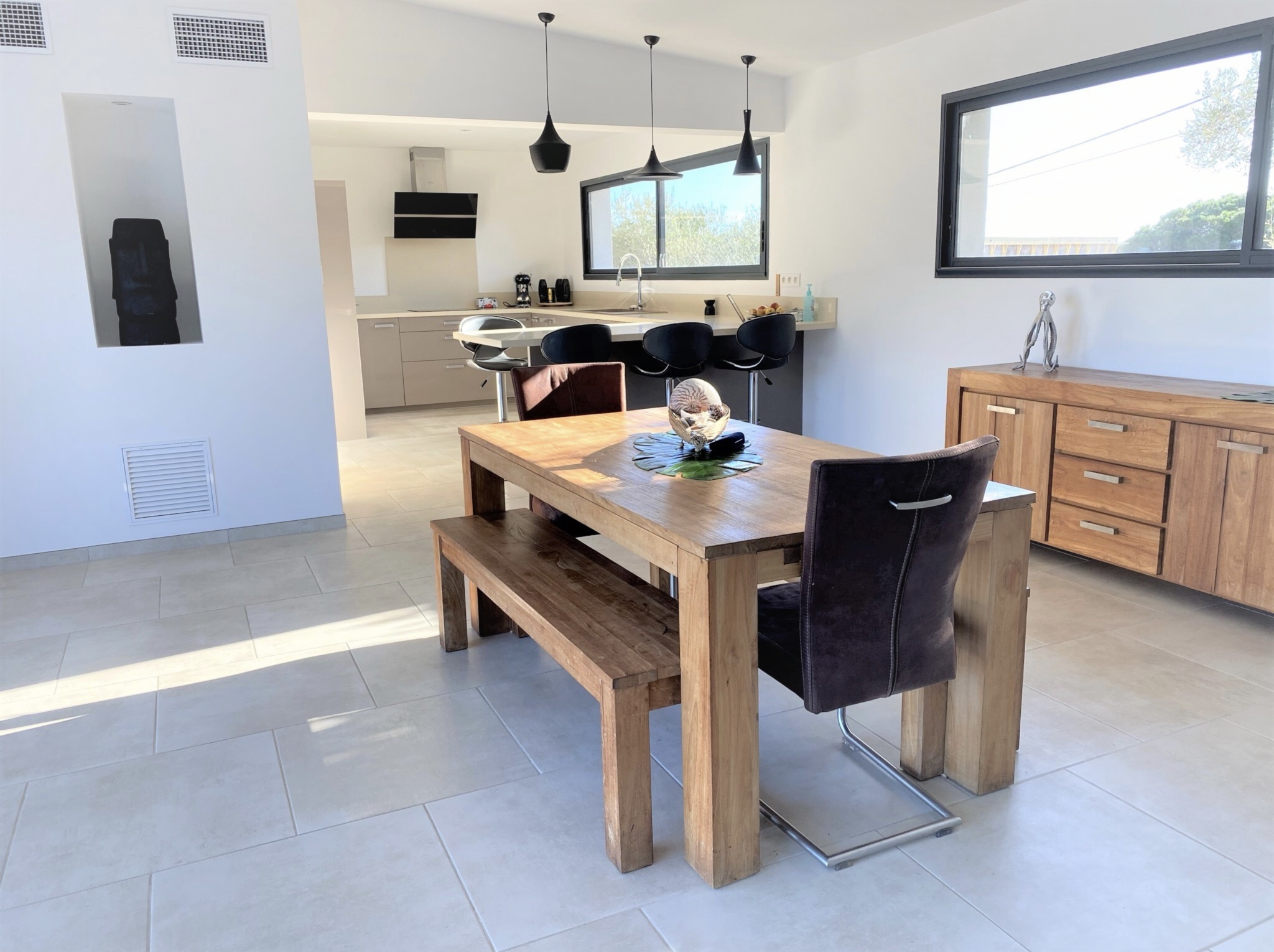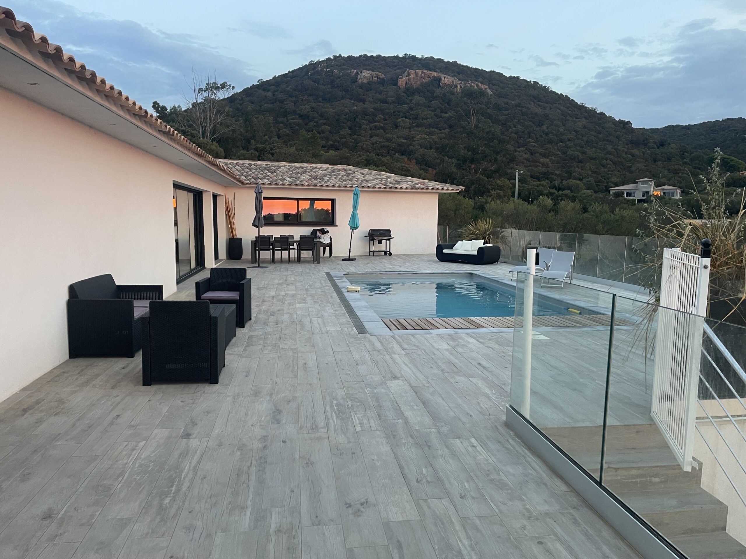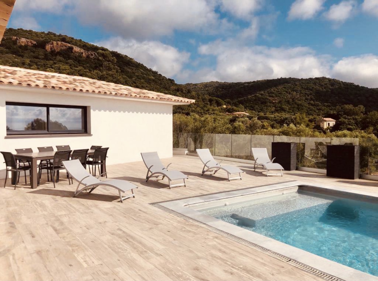 Villa récente de 180 m² entièrement climatisée se compose d’une lumineuse pièce de vie traversante avec une cuisine ouverte aménagée et équipée d’un four, micro-ondes, Nespresso + cafetière à grain, plaque à induction, lave vaisselle…, un cellier avec frigo américain, et lave-linge, un coin salon salle à manger avec TV, internet, baies vitrées à galandage donnant accès à une grande terrasse aménagée et équipée de mobilier de jardin, une piscine au sel de 8x4 m sécurisée par une alarme avec une vue panoramique sur la baie de Pinarello. Une suite parentale avec lit en 160, salle d'eau, deux chambres avec lits en 140 et une chambre enfant avec un lit superposé et un lit gigogne.